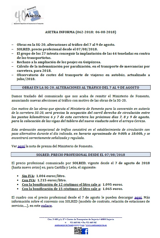 Obras en la SG-20, alteraciones al tráfico del 7 al 9 de agosto. SOLRED, precio profesional desde el 07/08/2018. El grupo de los 27 intenta conseguir la implantación de las 44 toneladas en contra de [...]