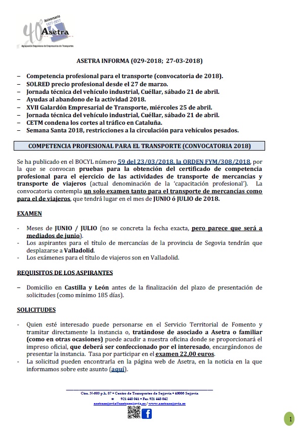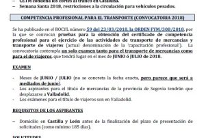 Competencia profesional para el transporte (convocatoria de 2018). SOLRED precio profesional desde el 27 de marzo. Jornada técnica del vehículo industrial, Cuéllar, sábado 21 de abril. Ayudas al abandono de la actividad 2018. XVII Galardón [...]