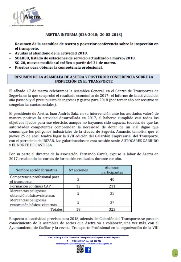 Resumen de la asamblea de Asetra y posterior conferencia sobre la inspección en el transporte. Ayudas al abandono de la actividad 2018. SOLRED, listado de estaciones de servicio actualizado a marzo/2018. SG-20, nuevas medidas al [...]