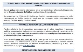 Semana Santa 2018, restricciones a la circulación para vehículos pesados. Ayudas al abandono de la actividad 2018. Resultado de la campaña de la DGT. Visado de las autorizaciones de transporte de mercancías en 2018. Pruebas [...]