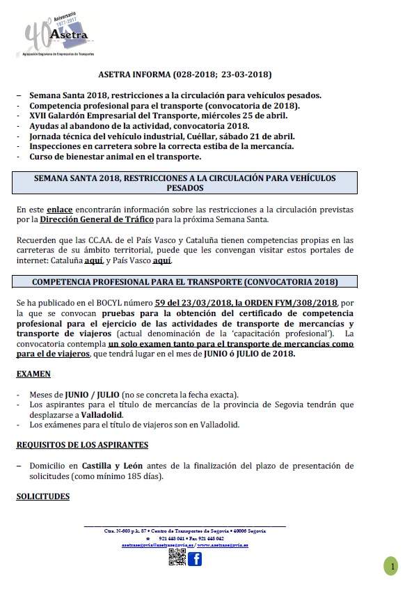 Semana Santa 2018, restricciones a la circulación para vehículos pesados. Competencia profesional para el transporte (convocatoria de 2018). XVII Galardón Empresarial del Transporte, miércoles 25 de abril. Ayudas al abandono de la actividad, convocatoria 2018. [...]