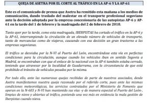 Queja de Asetra por el corte al tráfico en la AP-6 y la AP-61