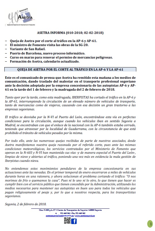 Queja de Asetra por el corte al tráfico en la AP-6 y AP-61. El ministro de Fomento visita las obras de la SG-20. Variante de San Rafael. Puerto de Barcelona, nuevo proceso informático. Curso en [...]