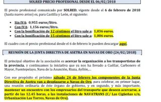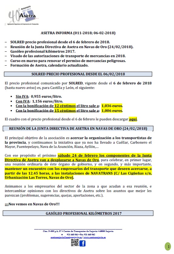 SOLRED precio profesional desde el 6 de febrero de 2018. Reunión de la Junta Directiva de Asetra en Navas de Oro (24/02/2018). Gasóleo profesional kilómetros 2017. Visado de las autorizaciones de transporte de mercancías en [...]