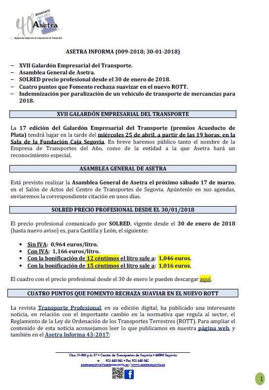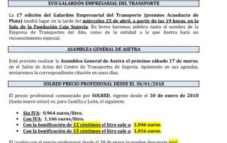 XVII Galardón Empresarial del Transporte. Asamblea General de Asetra. SOLRED precio profesional desde el 30 de enero de 2018. Cuatro puntos que Fomento rechaza suavizar en el nuevo ROTT. Indemnización por paralización de un vehículo [...]