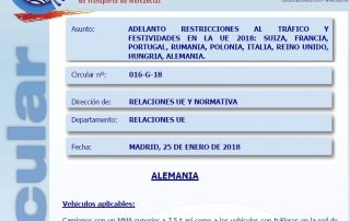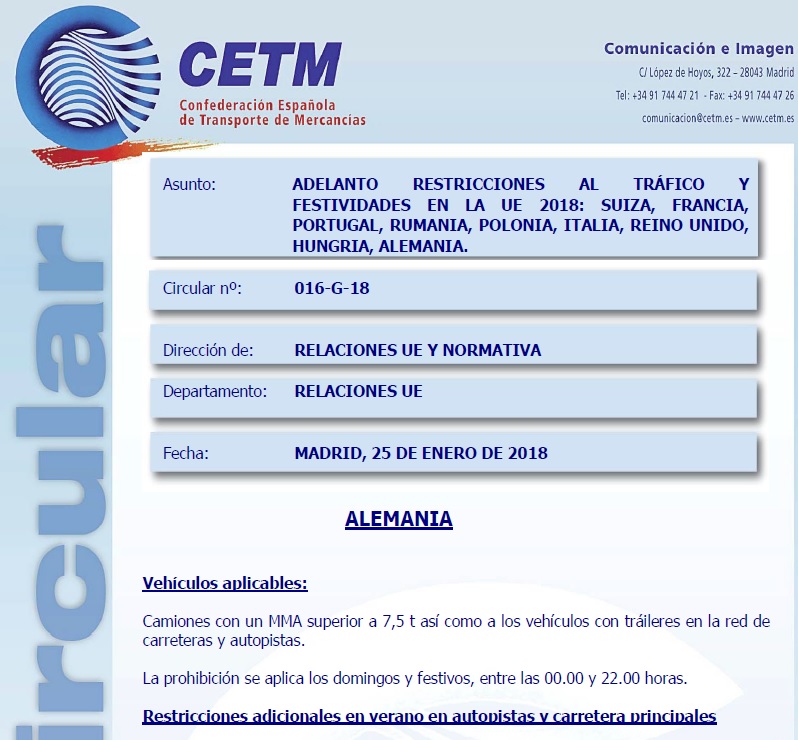 CETM ha preparado un adelanto con las restricciones al tráfico para 2018 en algunos países de la Unión Europea. Se puede acceder a ese informe en este enlace.