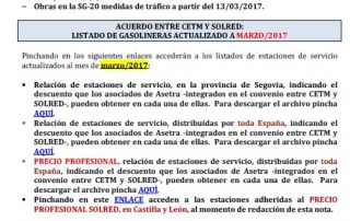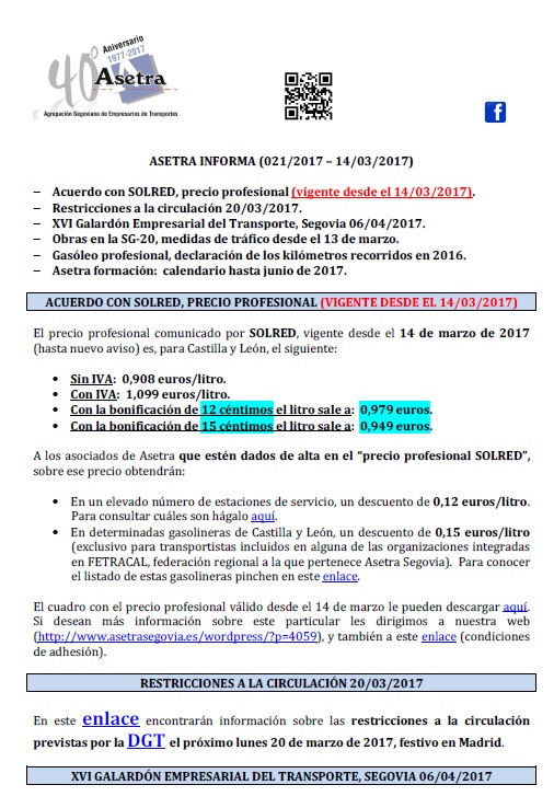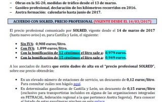 Acuerdo con SOLRED, precio profesional (vigente desde el 14/03/2017). Restricciones a la circulación 20/03/2017. XVI Galardón Empresarial del Transporte, Segovia 06/04/2017. Obras en la SG-20, medidas de tráfico desde el 13 de marzo. Gasóleo profesional, [...]