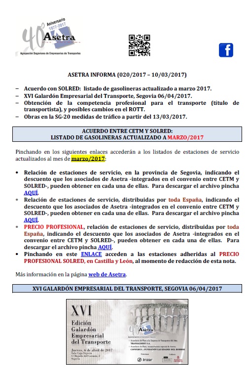 Acuerdo con SOLRED: listado de gasolineras actualizado a marzo 2017. XVI Galardón Empresarial del Transporte, Segovia 06/04/2017. Obtención de la competencia profesional para el transporte (título de transportista), y posibles cambios en el ROTT. Obras [...]