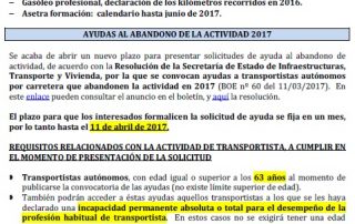 Ayudas al abandono de la actividad para transportistas autónomos 2017. Competencia profesional para el transporte (convocatoria 2017). SOLRED: precio profesional. XVI Galardón Empresarial del Transporte (06/04/2017). Reclamación de daños al cártel de fabricantes de camiones. [...]