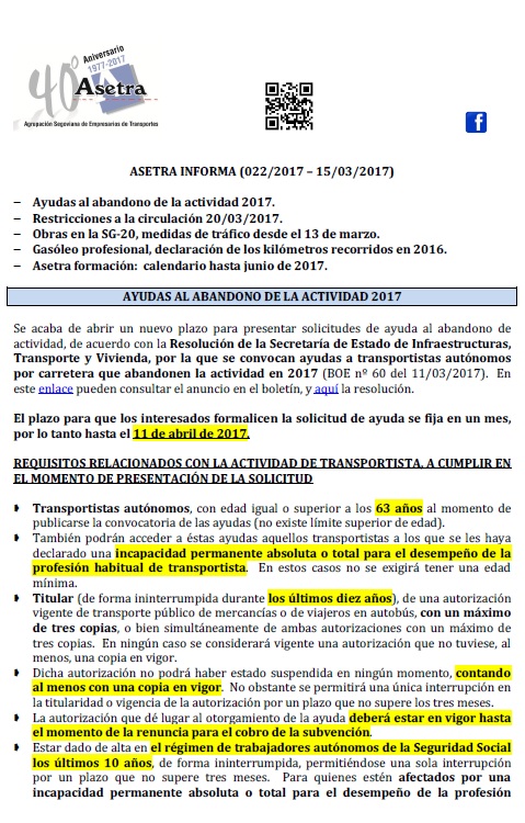 Ayudas al abandono de la actividad 2017. Restricciones a la circulación 20/03/2017. Obras en la SG-20, medidas de tráfico desde el 13 de marzo. Gasóleo profesional, declaración de los kilómetros recorridos en 2016. Asetra formación: [...]