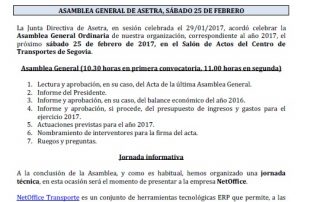 Asamblea General de Asetra (25/02/2017). SOLRED: precio profesional. Gasóleo profesional, declaración de los kilómetros realizados en 2016. Situación del salario mínimo en algunos países de la UE al comienzo de 2017. Cursos previstos hasta junio [...]