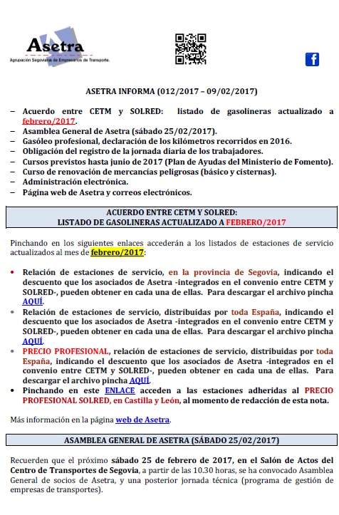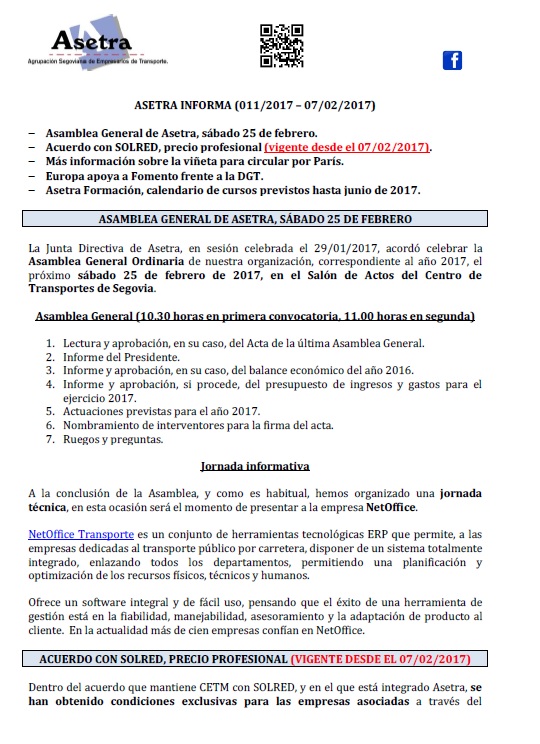 Asamblea General de Asetra, sábado 25 de febrero. Acuerdo con SOLRED, precio profesional (vigente desde el 07/02/2017). Más información sobre la viñeta para circular por París. Europa apoya a Fomento frente a la DGT. Asetra [...]