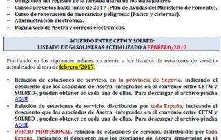 Acuerdo entre CETM y SOLRED: listado de gasolineras actualizado a febrero/2017. Asamblea General de Asetra (sábado 25/02/2017). Gasóleo profesional, declaración de los kilómetros recorridos en 2016. Obligación del registro de la jornada diaria de los [...]
