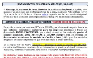 El domingo 29 de enero la Junta Directiva de Asetra se desplazará a Ayllón, para mantener un encuentro con los transportistas de la zona, en el hotel Ayllón (Plaza Mayor, 7), a partir de las [...]