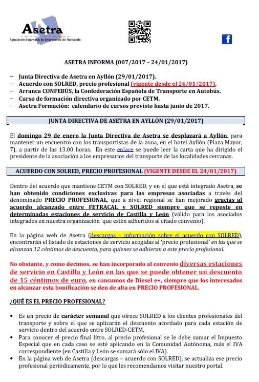 Junta Directiva de Asetra en Ayllón (29/01/2017). Acuerdo con SOLRED, precio profesional (vigente desde el 24/01/2017). Arranca CONFEBÚS, la Confederación Española de Transporte en Autobús. Curso de formación directiva organizado por CETM. Asetra Formación: calendario [...]