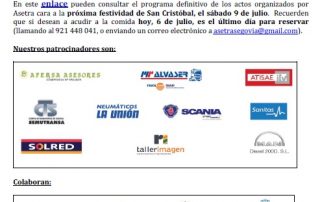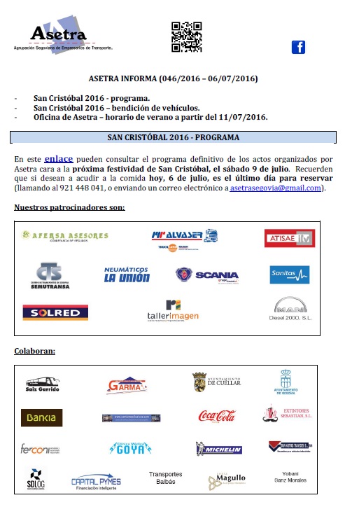San Cristóbal 2016 - programa. San Cristóbal 2016 – bendición de vehículos. Oficina de Asetra – horario de verano a partir del 11/07/2016. Para descargar el archivo pincha aquí