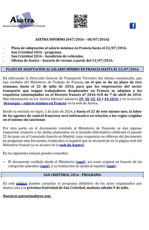 Plazo de adaptación al salario mínimo en Francia hasta el 22/07/2016. San Cristóbal 2016 - programa. San Cristóbal 2016 – bendición de vehículos. Oficina de Asetra – horario de verano a partir del 11/07/2016. Para [...]