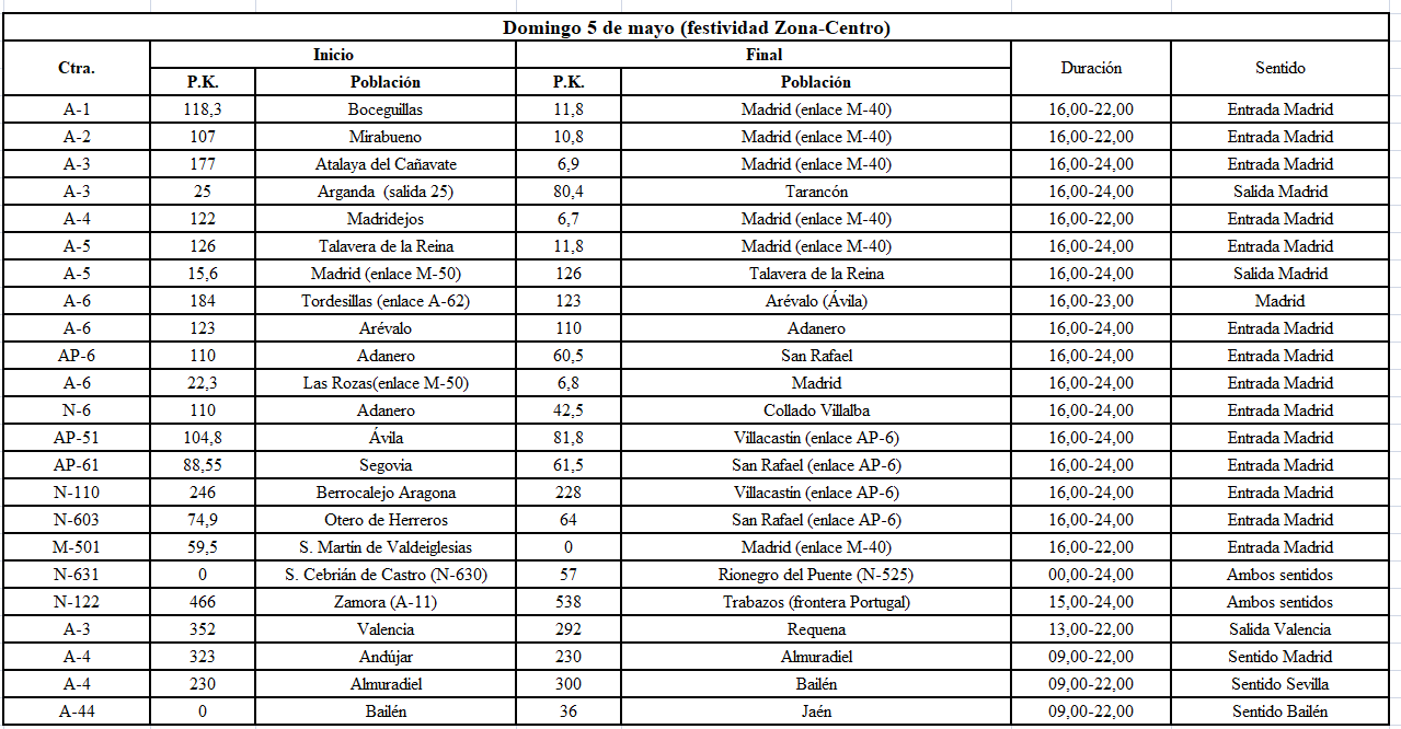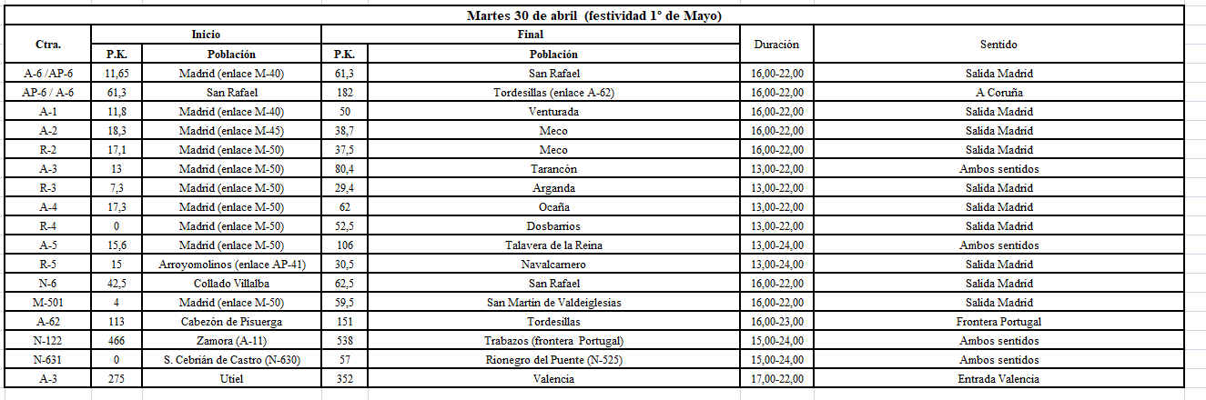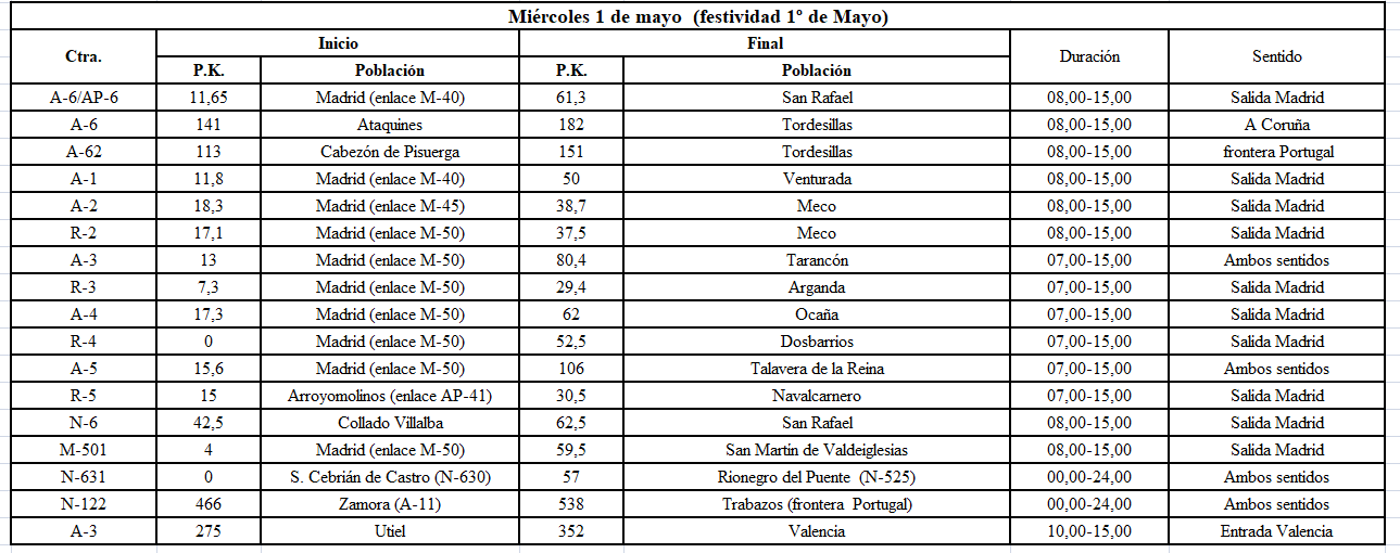 En este enlace pueden consultar las restricciones a la circulación previstas por la Dirección General de Tráfico en los meses de abril y mayo de 2024. Estén especialmente atentos a los festivos en Madrid, 1 y 2 de mayo.