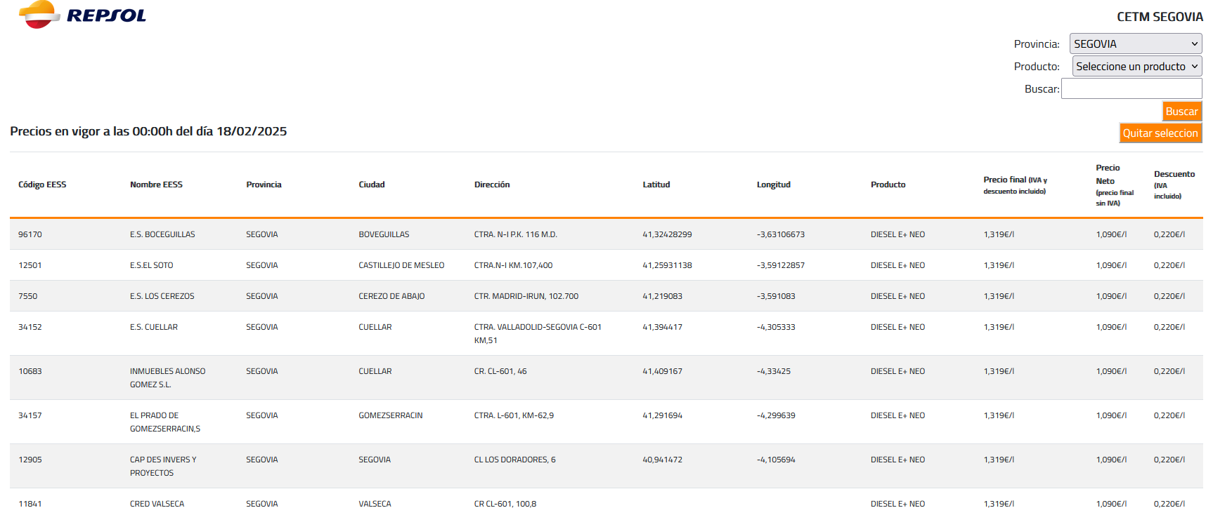 Accediendo a este enlace pueden hacer una consulta sobre las gasolineras de toda España, y en el siguiente cuadro relacionamos las estaciones de servicio de la provincia de Segovia con 22 céntimos de descuento en ‘precio profesional’: